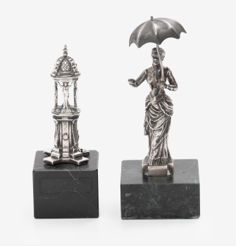 Lote compuesto por 2 figuras en plata representando "Font Vuitcentista. Barcelona" y "Dama con paraguas". Marcas de platero. Bases en mármol.