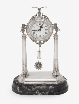 Reloj de sobremesa en plata con columnas a los lados y decoración de leones, águila, busto de niño y vegetal. Base en mármol.