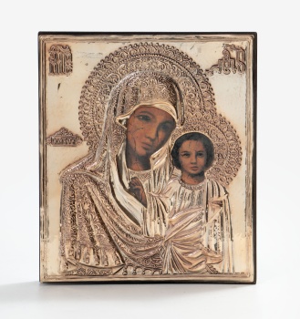 Icono en plata y plata dorada representando Virgen con el niño Jesús y decoración vegetal. Marco en madera. Estilo bizantino. Marcas de platero.