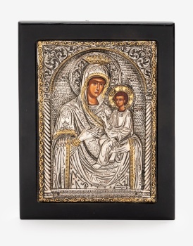 Icono en plata representando Virgen con niño Jesús. Marco en madera. Estilo bizantino. Marcas de platero.