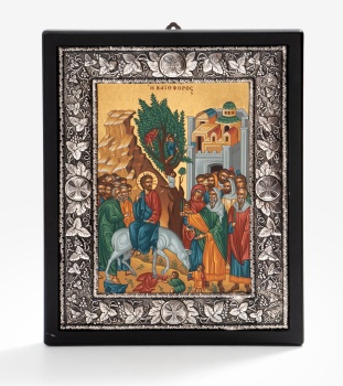 Icono con escena central representando "Entrada triunfal de Jesús en Jerusalén". Marco en plata en relieve con decoración de hojas de parra y racimo de uvas. Marco en madera. Estilo bizantino. Marcas de platero.