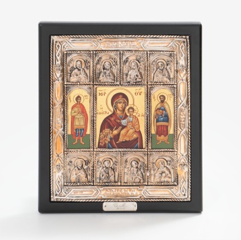Icono en plata con escena central representando Virgen con niño Jesús y apóstoles alrededor y decoración de lazo y cruces. Marco en madera. Estilo bizantino. Marcas de platero.