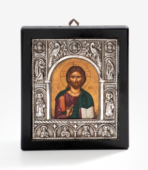 Icono pintado representando a Jesucristo marco alrededor en plata con decoración de ángeles, apóstoles, animales, etc. Estilo bizantino. Marcas de platero.