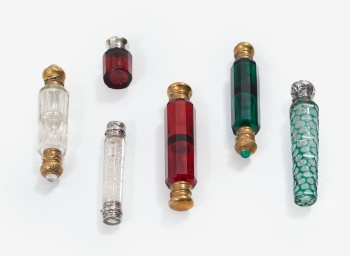 Lote compuesto por 6 esencieros en cristal de diferentes colores y tallado con tapones en plata dorada y metal plateado con decoración de flores, hojas y rocallas. Estilo Luis XVI.