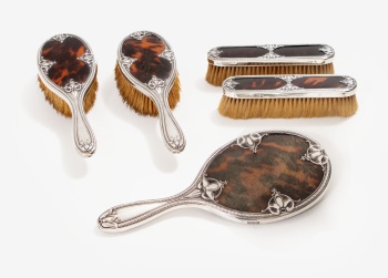 Juego de tocador en plata y carey con decoración de hojas, flores y perlas compuesto por: espejo de mano, 2 cepillos de pelo y 2 cepillos de ropa. Estilo Regencia. Marcas de platero. Inglaterra.