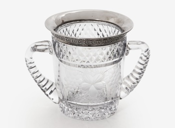 Hielera en cristal tallado y grabado con decoración de hojas de parra y racimos de uvas y bisel en plata. Marcas de platero.
