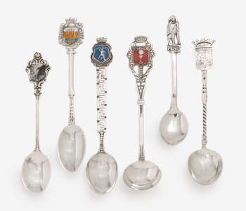 Lote compuesto por 6 cucharillas en plata y esmalte con los escudos Cuenca, Huelva, Cuidadela, Rhodes, Perú y con decoración vegetal. Marcas de platero.