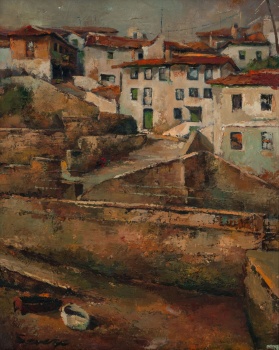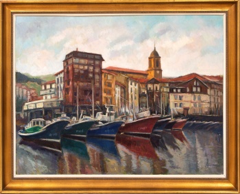 (Baracaldo, Vizcaya S. XX) "Vista de Bermeo" Firmado: Juanón Óleo / Lienzo 79 x 112 cm. ; 93 x 127 cm. (con marco) Pequeños deterioros