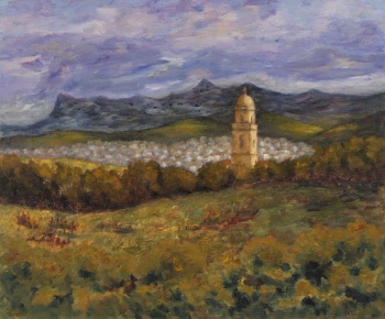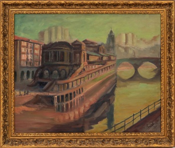 (Berga, Barcelona 1930) "Vista del Mercado de la Ribera y San Antón " Firmado: Bach Óleo / Lienzo 50 x 61 cm. ; 61 x 71 cm. (con marco)