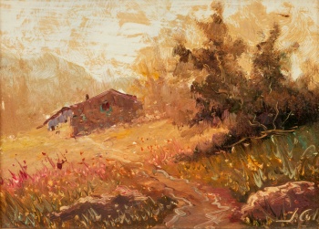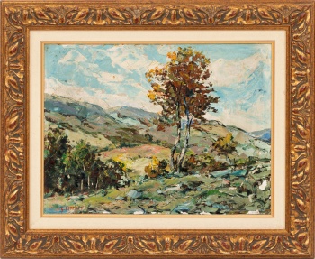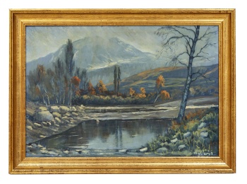 (Hungría 1909 - 1960) "Paisaje montañoso" Firmado: G. Esteban Óleo / Cartón 34 x 45 cm.; 51 x 61 cm. (con marco)