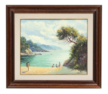 (1920-2013) "Vista de playa con personajes" Firmado: Ballarin Óleo / Lienzo 46 x 55 cm. ; 66,5 x 75,5 cm. (con marco)