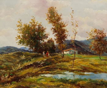 (1927-1973) "Paisaje con caserío y personajes en el camino " Firmado: J. Serra i Calvó Óleo / Lienzo pegado a cartón 48 x 60 cm. ; 64 x 74 cm. (con marco)