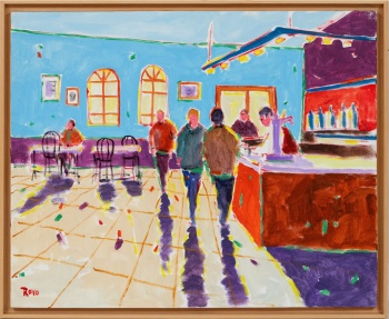 (Valencia 1940) "Personajes en la barra del bar" Firmado: Royo Acrílico / Lienzo 60 x 73 cm.; 64,5 x 77,5 cm. (con marco)