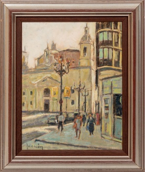 (Baracaldo, Vizcaya S. XX) "Vista de la Iglesia de San Nicolas con personajes. Bilbao" Firmado: Juanón Óleo / Lienzo 34 x 27 cm. ; 44 x 37,5 cm. (con marco)