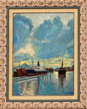 (Baracaldo, Vizcaya S. XX) "Vista de la ría de Bilbao, barcos y Monte Serantes al fondo" Firmado: Juanón Óleo / Cartón 40 x30 cm. ; 51,5 x 41,5 cm. (con marco)