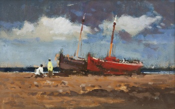(S. XX) "Barcas atracadas en la playa con personajes" Óleo / Papel 20 x 31 cm.