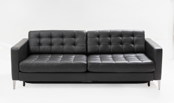 Sofá - cama de 3 plazas en piel negra, con patas en metal cromado.