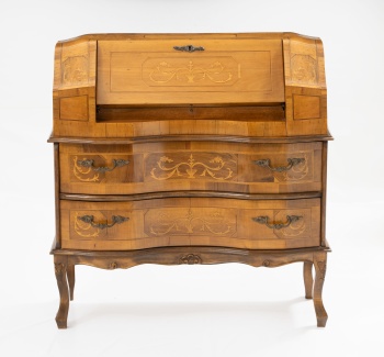 Secreter en madera de caoba, palosanto y marquetería con decoración vegetal y jarrones de flores. Interior con cajones y departamentos. Estilo Luis XV.