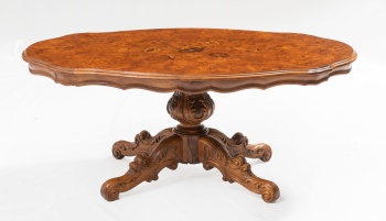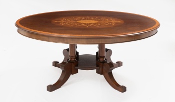 Mesa de centro oval en madera de caoba y marquetería con decoración vegetal y medallón central. Estilo Victoriano.