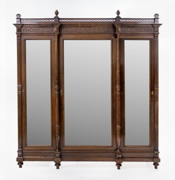 Armario de habitación de 3 cuerpos en madera de caoba tallada con decoración geométrica, vegetal y columnas, con puertas de luna de espejo. Estilo Luis XVI.