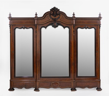 Gran armario de habitación de tres cuerpos en madera de raíz, ébano y caoba con decoración vegetal, flores y rocalla, puertas con espejos biselados, remates y copete en madera ebonizada, 3 cajones en la parte inferior. Época Napoleón III.
