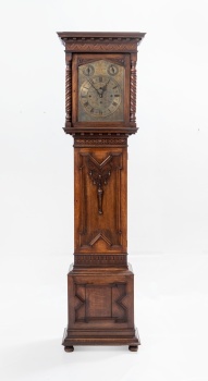 Reloj de pie en madera de roble tallada con decoración vegetal, geométrica y columnas a los lados, esfera en metal decoración vegetal, números romanos, melodía Westminster con 8 tubos. Maple. Estilo Regencia. London.