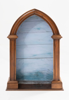 Hornacina con forma de capilla en madera de roble y nogal tallada con columnas laterales y trasera pintada. Estilo Luis XVI.