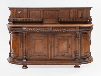 Aparador de comedor en madera de roble tallada, columnas laterales con decoración vegetal y copete central con decoración de arcos. Estilo Luis XVI.