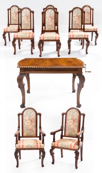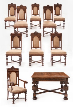 Conjunto de mesa de comedor extensible y sillería compuesta por butaca y 8 sillas en madera de roble tallada con decoración vegetal, rocallas y bustos de personajes. Asiento y respaldo tapizado en tono beige. Estilo Luis XVI. Época Neogótica.