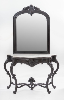 Consola y espejo en madera lacada en negro y tallada con decoración vegetal, rocallas, jarrón de flores y copete central. Encimera de mármol. Estilo Luis XV. Época Napoleón III. Francia.