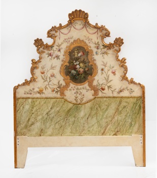 Cabecero en madera tallada, pintada y dorada con decoración vegetal, flores y falso mármol. Copete representando rocallas. Estilo Luis XV.