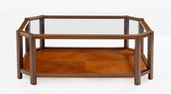 Mesa de centro en madera de caoba y marquetería con encimera en cristal. Estilo Regencia.