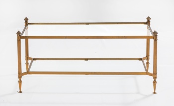 Mesa de centro en metal dorado con decoración de piñas, encimera y balda inferior en cristal. Estilo Luis XVI.