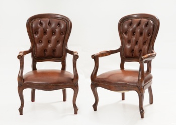 Pareja de butacas en madera de caoba con asiento, reposabrazos y respaldo en piel marrón tapizado capitoné rematando con tachuelas. Estilo Luis XV.