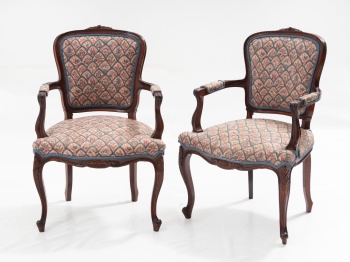 Pareja de butacas en madera de caoba tallada con decoración de flores, asiento, respaldo y reposabrazos con tapizado vegetal. Estilo Luis XV.