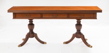 Mesa libro - consola en madera de caoba con patas talladas representando copas, 3 cajones y remates en bronce. Estilo Regencia.