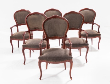 Conjunto de 6 butacas de comedor en madera de caoba, con asiento y respaldo tapizado en pana tono marrón rematando en tachuelas. Estilo Luis XV.