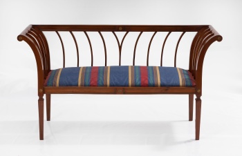 Banco de hall en madera de caoba tallada con remates en metal dorado y tapizado de rayas. Estilo Regencia.