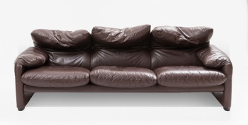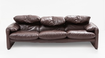 Sofá de 3 plazas en piel color marrón, espuma de poliuretano inyectada, relleno Dacron y almohadones Fiberfill. Mobilplast. Diseño: V. Magistretti. Colección: Cassina.