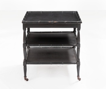 Mesa de 3 alturas en madera imitando bambú, lacada en negro, rematando con ruedas.