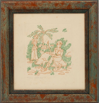 (S. XX) "Jóvenes con cerdo " Grabado color / Papel Ejemplar: 125/150 33 x 30 cm. ; 44 x 41,5 cm. (con marco)