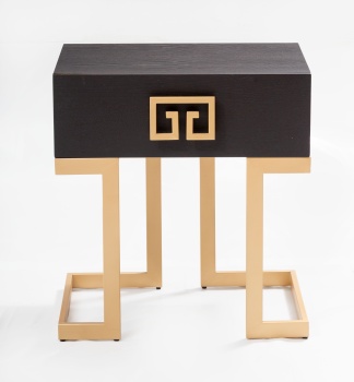 Mesilla de noche en madera de roble teñida y base en metal lacado, cajón y tirador con diseño asiático. Idelum.