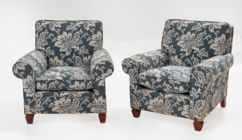 Pareja de butacas con tapizado de flores en tonos azul y beige, con patas en madera tallada.