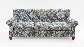 Sofá con tapizado de flores en tonos azul y beige, con patas en madera tallada.