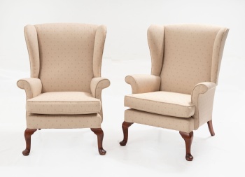 Pareja de butacas orejeras tapizadas en tono beige con decoración vegetal y patas en madera de guinea tallada. Estilo Victoriano.