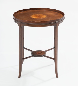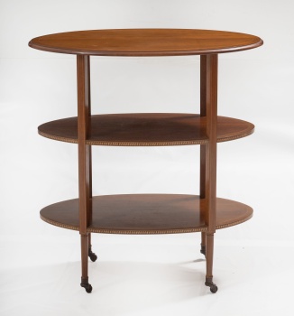 Mesa oval de baldas en madera de caoba y marquetería con decoración geométrica, rematando en ruedas. Estilo Eduardino.