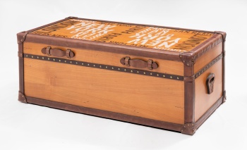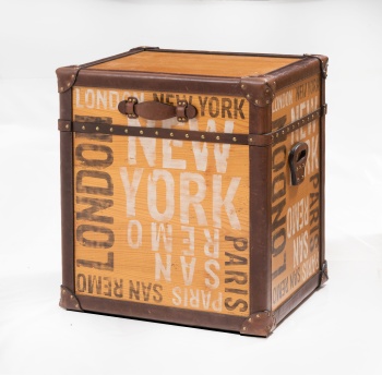 Baúl en madera con refuerzos y asas en cuero marrón, remachando con tachuelas, decoración de tipografía con ciudades icónicas del mundo. W. H. Preston. Estilo Industrial.