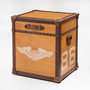 Baúl en madera con refuerzos en cuero marrón remachando con tachuelas, decoración numérica y escudo de aviación antigua. W. H. Preston. Estilo Industrial.