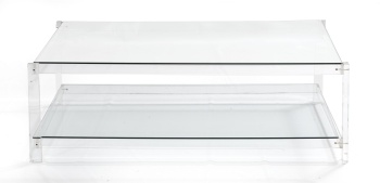 Mesa de centro en metacrilato con encimera y balda inferior en cristal.