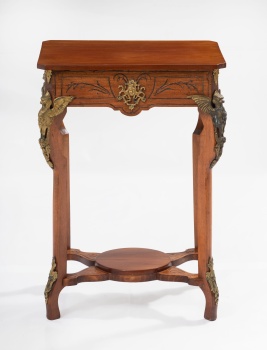 Mesa en madera de roble tallado con decoración vegetal. Remates en bronce representando animales alados, carátulas y rocallas. Estilo Luis XVI.